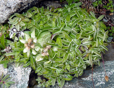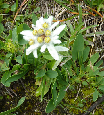 L'edelweiss (nom masculin, mot allemand) est une plante à tiges et feuilles duveteuses, aux fleurs regroupées en capitules serrés, entourés d'une collerette de feuilles laineuses, poussant dans les montagnes d'Europe occidentale à partir de 1500 mètres (GenreLeontopodium, famille des composées). Noms usuels:pied-de-lion, étoile-d'argent, immortelle des neiges. (Source: Le petit Larousse 2001)